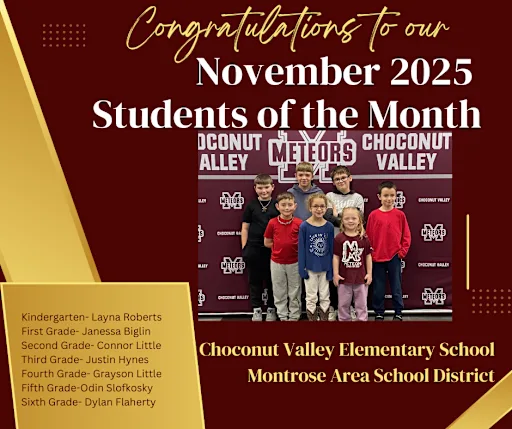 Congratulations to ourNovember 2025Students of the Month(Backdrop text: Choconut Valley Meteors)Kindergarten – Layna RobertsFirst Grade – Janessa BiglinSecond Grade – Connor LittleThird Grade – Jus...